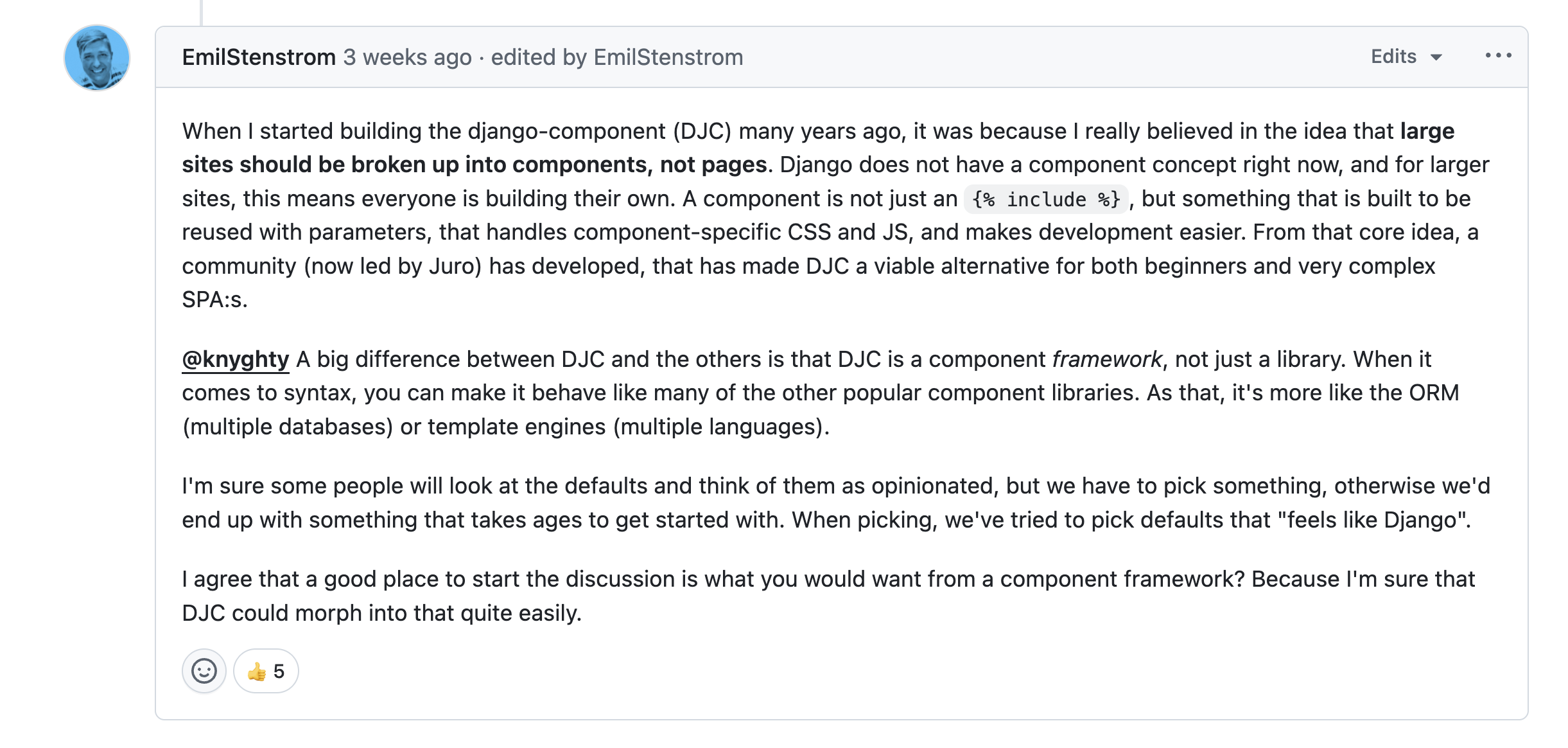 I also believe some features of Django-Components make it a little complex and might confuse people in some cases (some template syntax is heavily inspired by Vue.js).